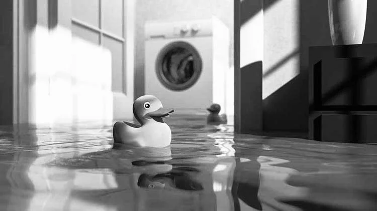 II. Our character wakes up from their slumber saturated in water. The Laundry room, now flooded, creates a moment of tranquility. Our character seems unphased, comforted by the floating clothes and laundry basket. Under the water is a glimmering object. They decide to submerge themselves swimming deeper towards the light.